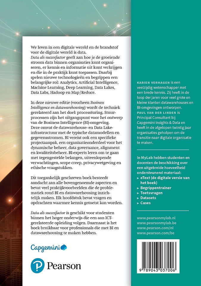Data als succesfactor geeft aan hoe je de groeiende stroom data binnen organisaties kunt organiseren, er kennis en informatie uit kunt verkrijgen en die in de praktijk kunt toepassen. Daarbij spelen nieuwe technologieën en begrippen een belangrijke rol: Analytics, Artificial Intelligence, Machine Learning, Deep Learning, Data Lakes, Data Labs, Hadoop en Map/Reduce.