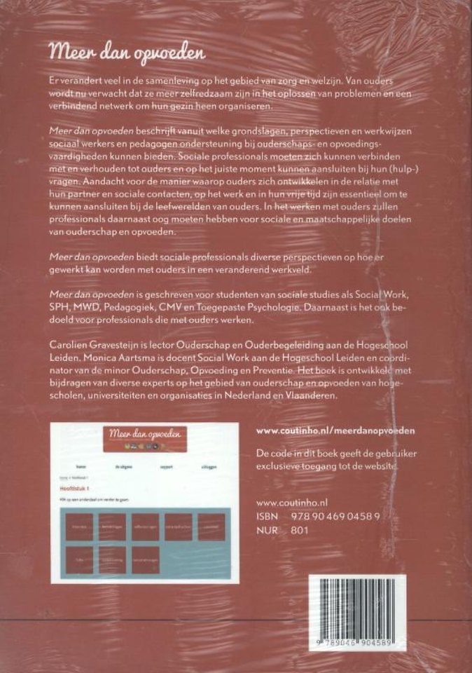 Meer dan opvoeden is geschreven voor studenten van sociale studies als Social Work, SPH, MWD, Pedagogiek, CMV en Toegepaste Psychologie maar is ook bedoeld voor de professionals die met ouders werken.