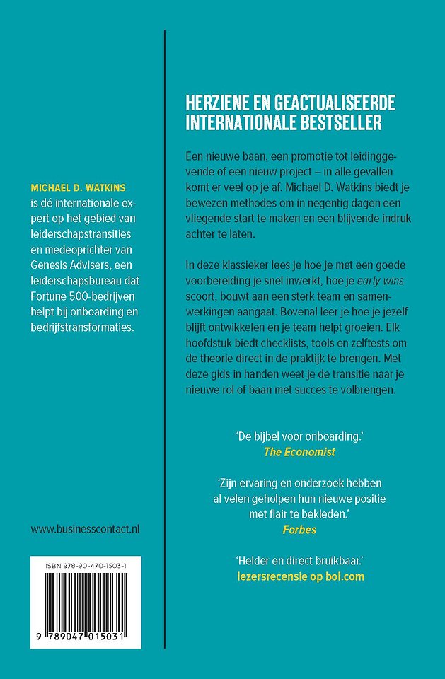 In deze klassieker lees je hoe je met een goede voorbereiding je snel inwerkt, hoe je early wins scoort, bouwt aan een sterk team en samenwerkingen aangaat. Bovenal leer je hoe je jezelf blijft ontwikkelen en je team helpt groeien. Elk hoofdstuk biedt checklists, tools en zelftests om de theorie direct in de praktijk te brengen. Met deze gids in handen weet je de transitie naar je nieuwe rol of baan met succes te volbrengen.
