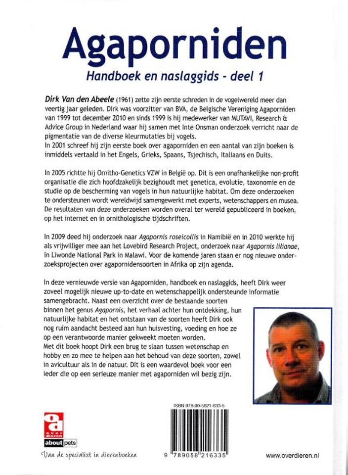 In deze vernieuwde versie van Agaporniden, handboek en naslaggids, heeft Dirk Van den Abeele weer zoveel mogelijk nieuwe up-to-date en wetenschappelijk ondersteunde informatie samengebracht. Naast een overzicht van de bestaande soorten binnen het genus Agapornis, het verhaal achter hun ontdekking, hun natuurlijke habitat en het ontstaan van de soorten heeft hij ook ruim aandacht besteed aan hun huisvesting, voeding en hoe ze op een verantwoorde manier gekweekt kunnen worden. Met dit boek hoop Dirk Van den Abeele een brug te slaan tussen wetenschap en hobby en zo mee te helpen aan het behoud van deze soorten, zowel in avicultuur als in de natuur.