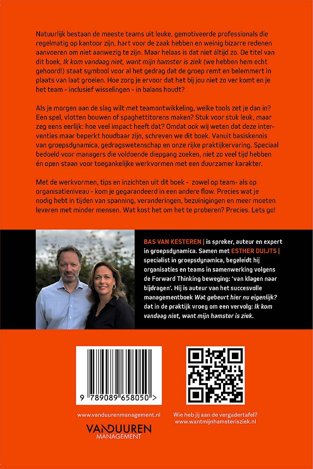 In Ik kom vandaag niet, want mijn hamster is ziek beschrijven de auteurs elf actuele uitdagingen in teams en geven ze veertien praktische, effectieve en vooral energieke werkvormen voor managers en hun teams om met die uitdagingen om te gaan.