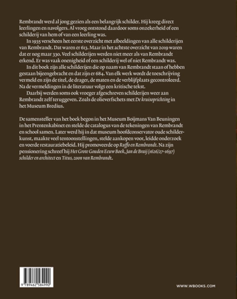 2019 genoemde schilderijen opgenomen. Er is nagegaan waar zij nu zijn en wat erover is gezegd. Titels, maten, signaturen en verblijfplaatsen zijn gecontroleerd. Elk schilderij heeft een korte tekst over toeschrijving, voorstelling en datering. Vaak is de mening van de samensteller over deze soms heikele kwesties toegevoegd. Er zijn hier zelfs enkele vroeger afgeschreven schilderijen aan Rembrandt toegekend.