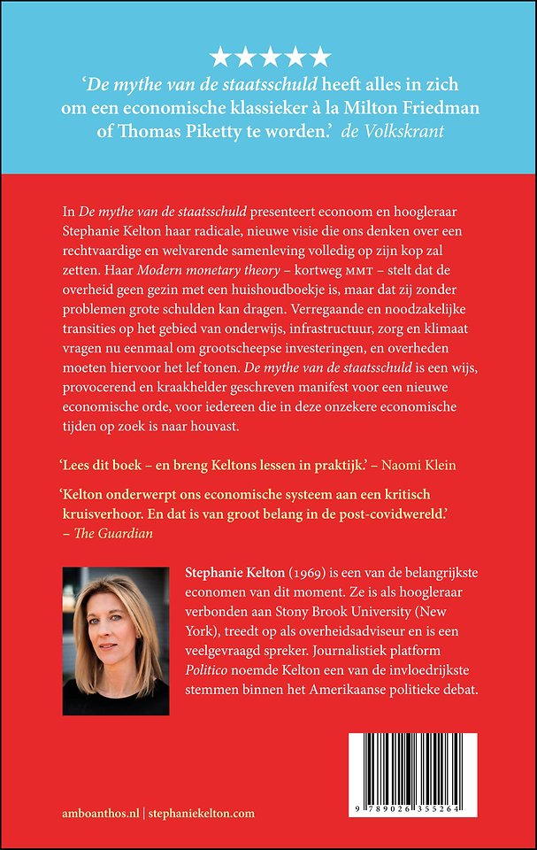 Modern monetary theory – kortweg MMT – stelt dat de overheid geen gezin met een huishoudboekje is, maar dat zij zonder problemen grote schulden kan dragen. Grootse en noodzakelijke transities op het gebied van onderwijs, infrastructuur, zorg en klimaat vragen nu eenmaal om grootscheepse investeringen, en overheden moeten het lef hiervoor tonen. Zoals Thomas Piketty ons denken over economische ongelijkheid deed omslaan, zo doet Kelton dat op het gebied van ons monetaire beleid: structurele begrotingstekorten zijn geen probleem maar een oplossing!